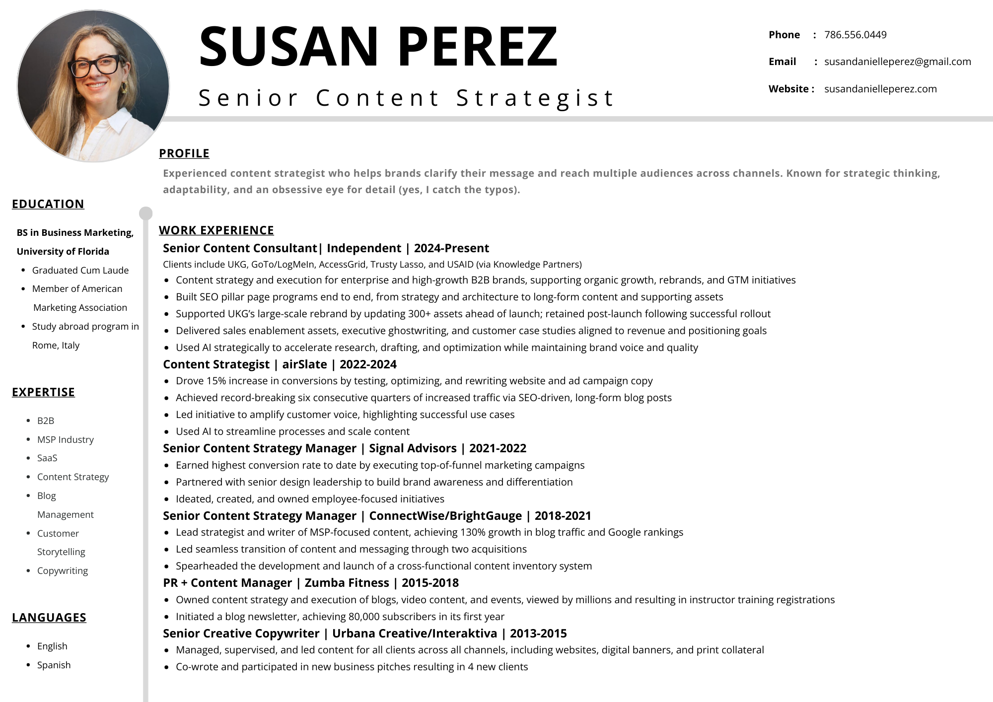 Susan is unbelievably thoughtful, thorough, and dedicated to providing the best work possible. She consistently goes above and beyond what is asked of her and it shows in the work she delivers.